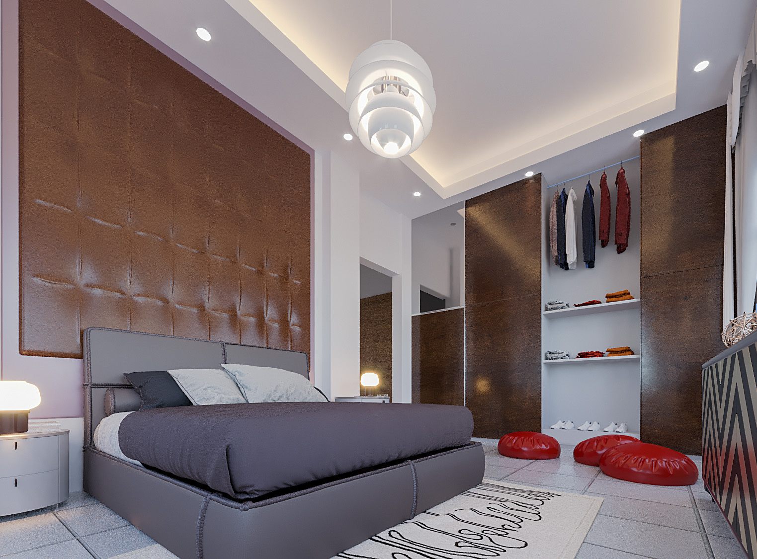 The room's design focuses on comfort and contemporary style, with an emphasis on organized, clutter-free space.
