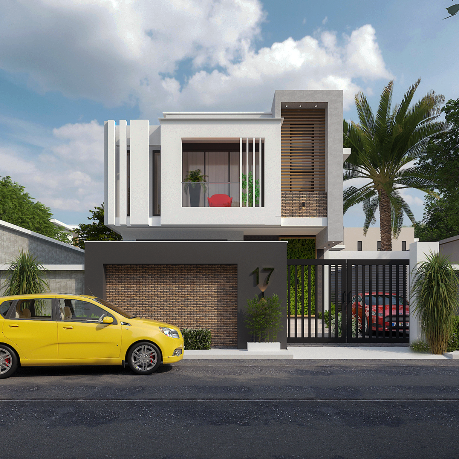The houses feature contemporary architectural designs, including a combination of brick and light-colored facades with large windows. The surroundings are well-maintained, with landscaping elements such as potted plants and a small garden